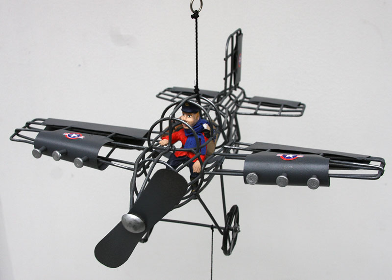 Avión artesanal en malla de alambre que evoca los primeros años de la aviación. Su estructura metálica abierta permite apreciar cada detalle del fuselaje, las alas y el tren de aterrizaje, resaltando un diseño ligero y lleno de carácter. Incorpora una figura de piloto en cabina, hélice frontal y ruedas estilizadas que conservan el encanto de los biplanos clásicos. Suspendido desde un resorte superior y acompañado de un pequeño globo terráqueo colgante, la pieza sugiere movimiento y aventura, como si estuviera listo para despegar hacia nuevos horizontes.