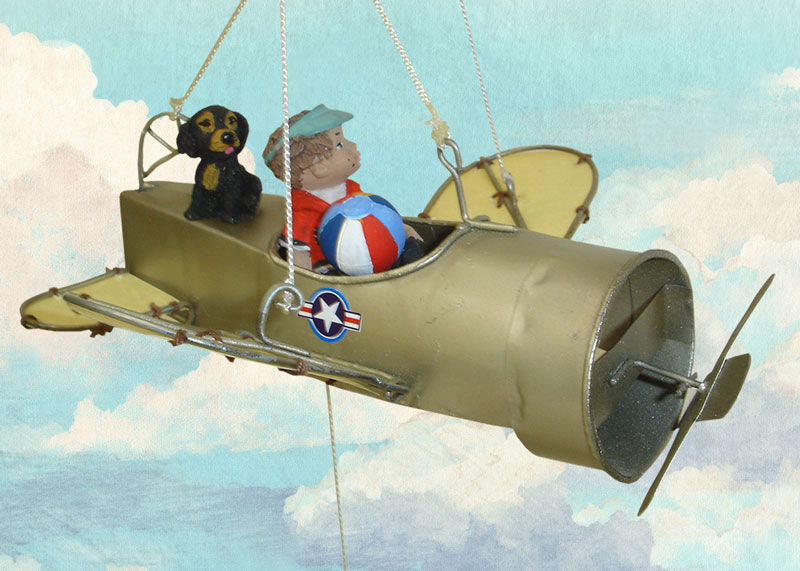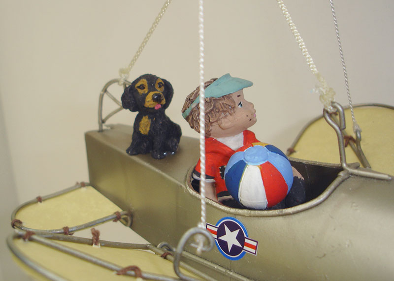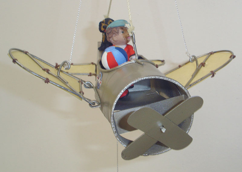 El Bombardero Papel es una pieza que rinde homenaje a los sueños infantiles de volar. Más pequeño y ligero que sus antecesores, este modelo combina estructura metálica con alas móviles elaboradas en lámina tipo pergamino, evocando los primeros intentos artesanales por conquistar el cielo. Su diseño transmite delicadeza y movimiento: las alas, enmarcadas con finos bordes, parecen extenderse como si estuvieran listas para atrapar el viento. En la cabina viaja un niño piloto sosteniendo un balón de colores, símbolo de juego, imaginación y libertad. Detrás, sobre el fuselaje, su fiel mascota lo acompaña en esta travesía aérea, añadiendo un toque entrañable a la escena.